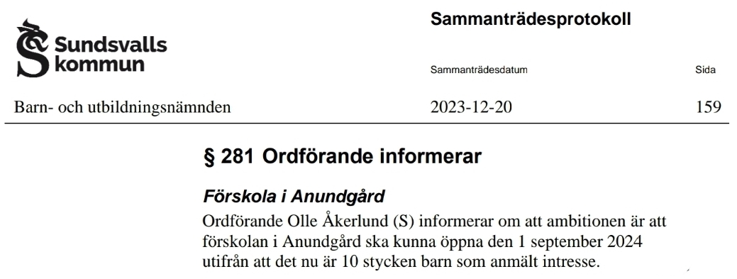 Den 27 november 2023 blev det återigen ett tillräckligt antal barn anmälda för att återstarta Anundgårds förskola. MEN, trots det finns fortfarande inget beslut i Sundsvalls kommun och från Majoriten (s, c, v) om att öppna förskolan och ingen annons ute efter pedagoger. Förutom att föräldrar och barn väntar, så är frågan redan är utredd sedan innan, pengar finns avsatta och lokalen står väntandes på att få öppna dörrarna. Än en gång fortsätter alltså Sundsvalls kommun att systematiskt fördröja återstarten av förskolan. På frågan varför, så svarar man inte. Precis som tidigare när det fanns ett barnunderlag, så undviker man och fördröjer.